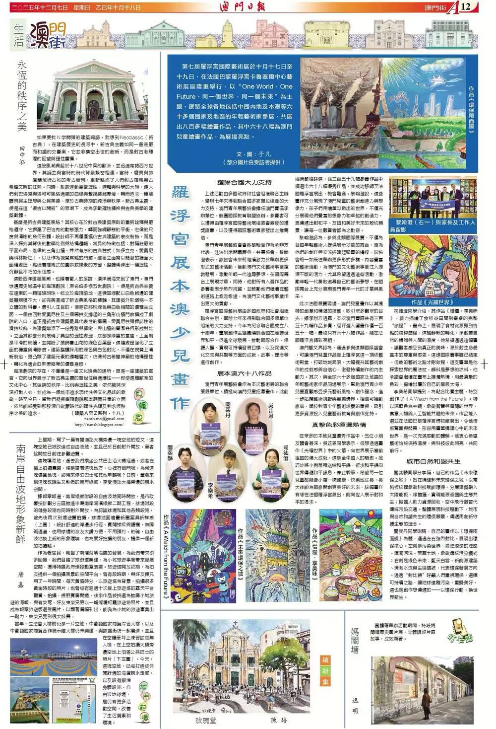 第七屆羅浮宮國際藝術展於十月十七日至十九日,在法國巴黎羅浮宮卡魯塞爾中心藝術展區隆重舉行,以“One World · One Future,同一個世界 · 同一個未來”為主題,匯聚全球各地包括中國內地及本澳等六十多個國家及地區的年輕藝術家參展,共展出八百多幅繪畫作品,其中六十八幅為澳門兒童繪畫作品,為展場亮點。